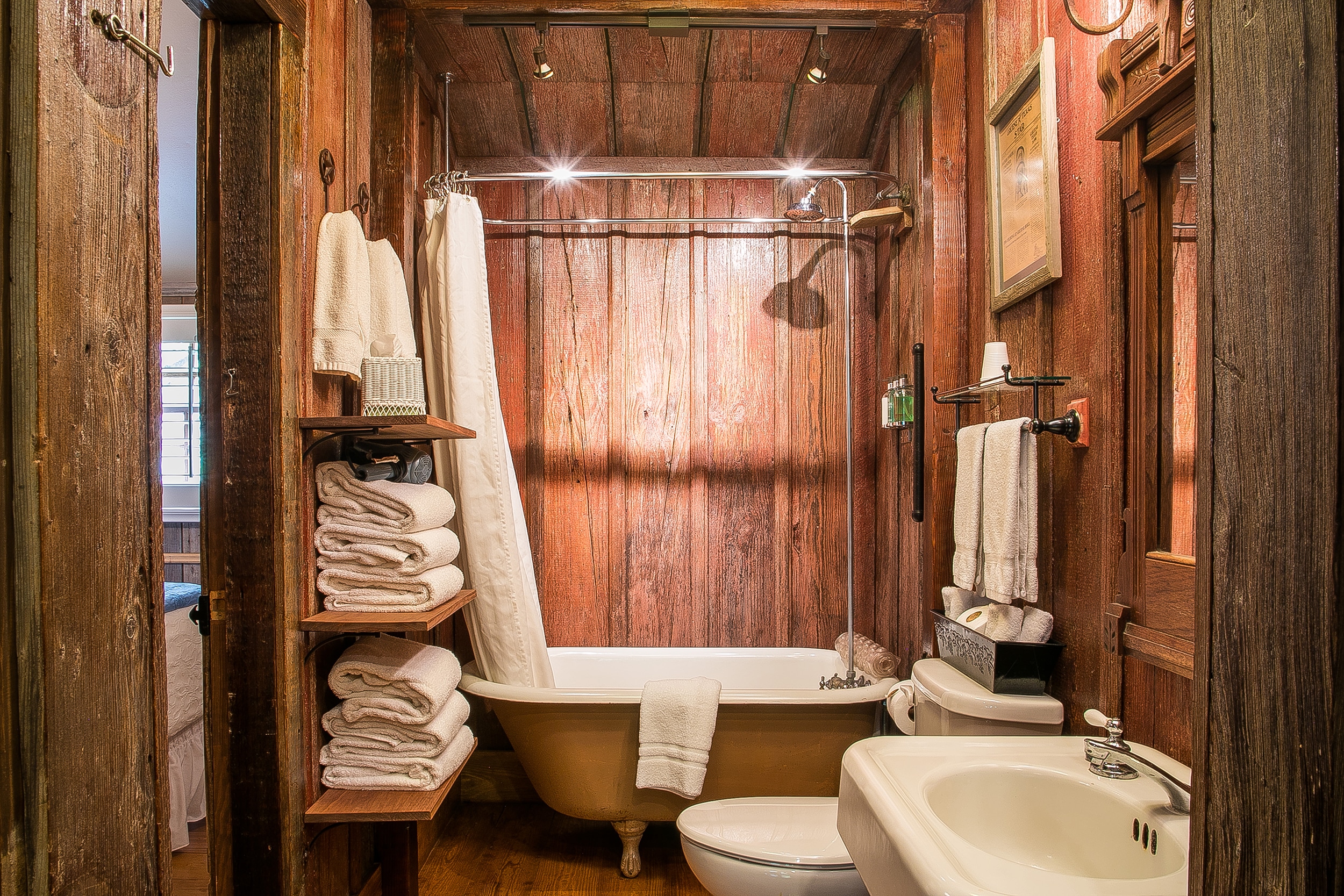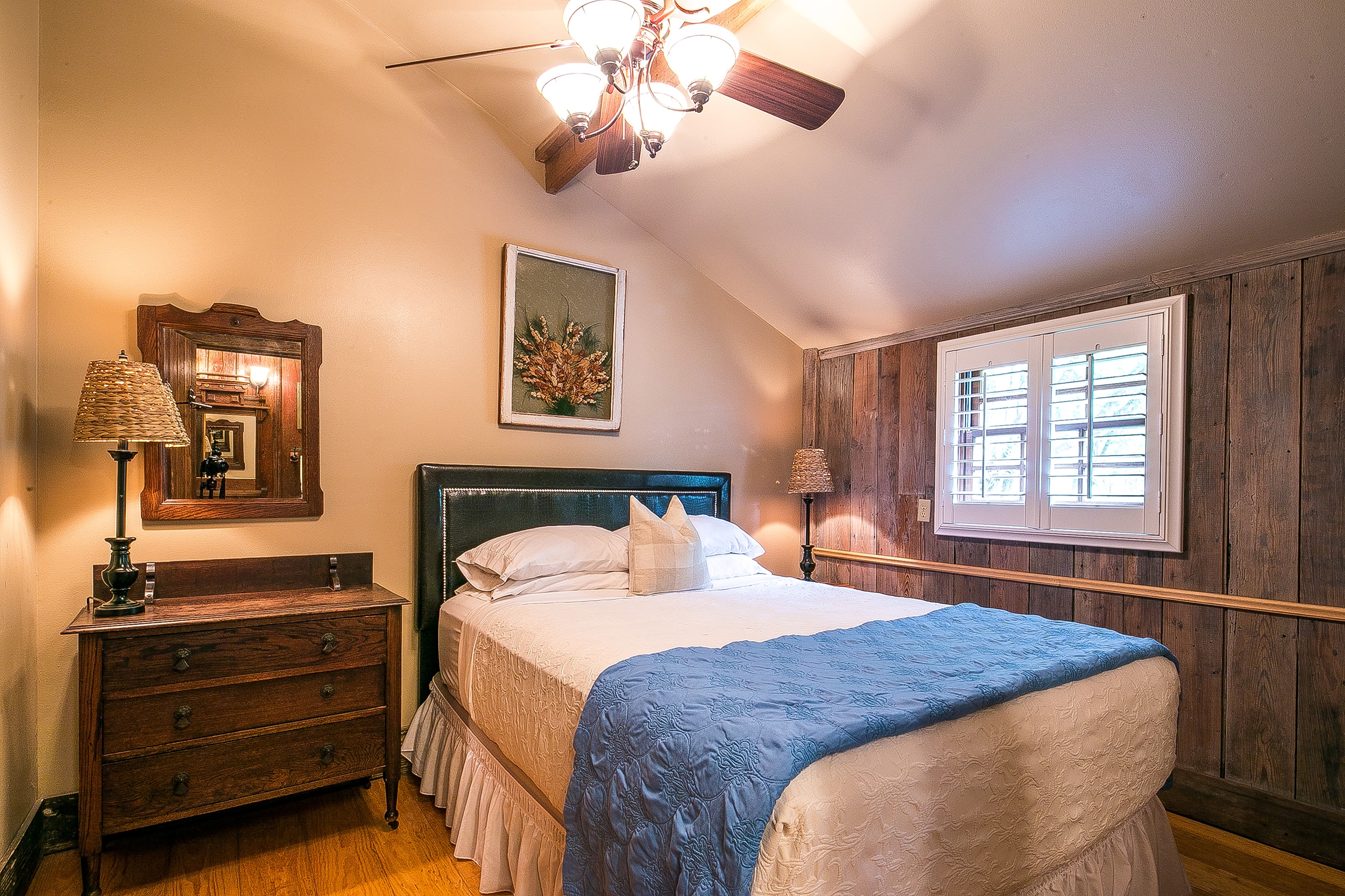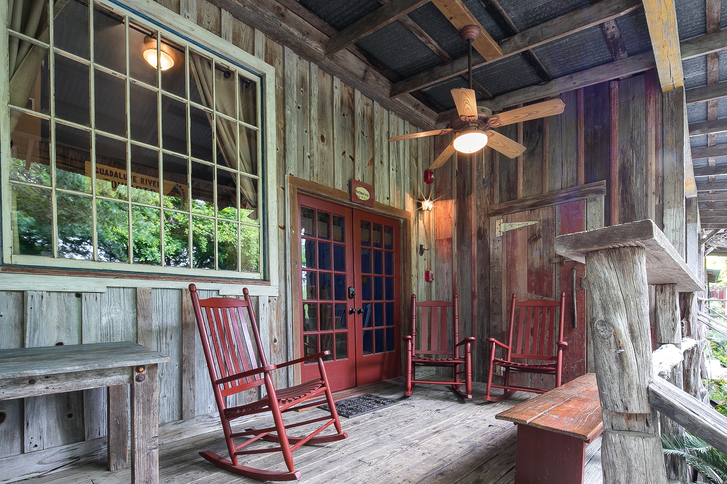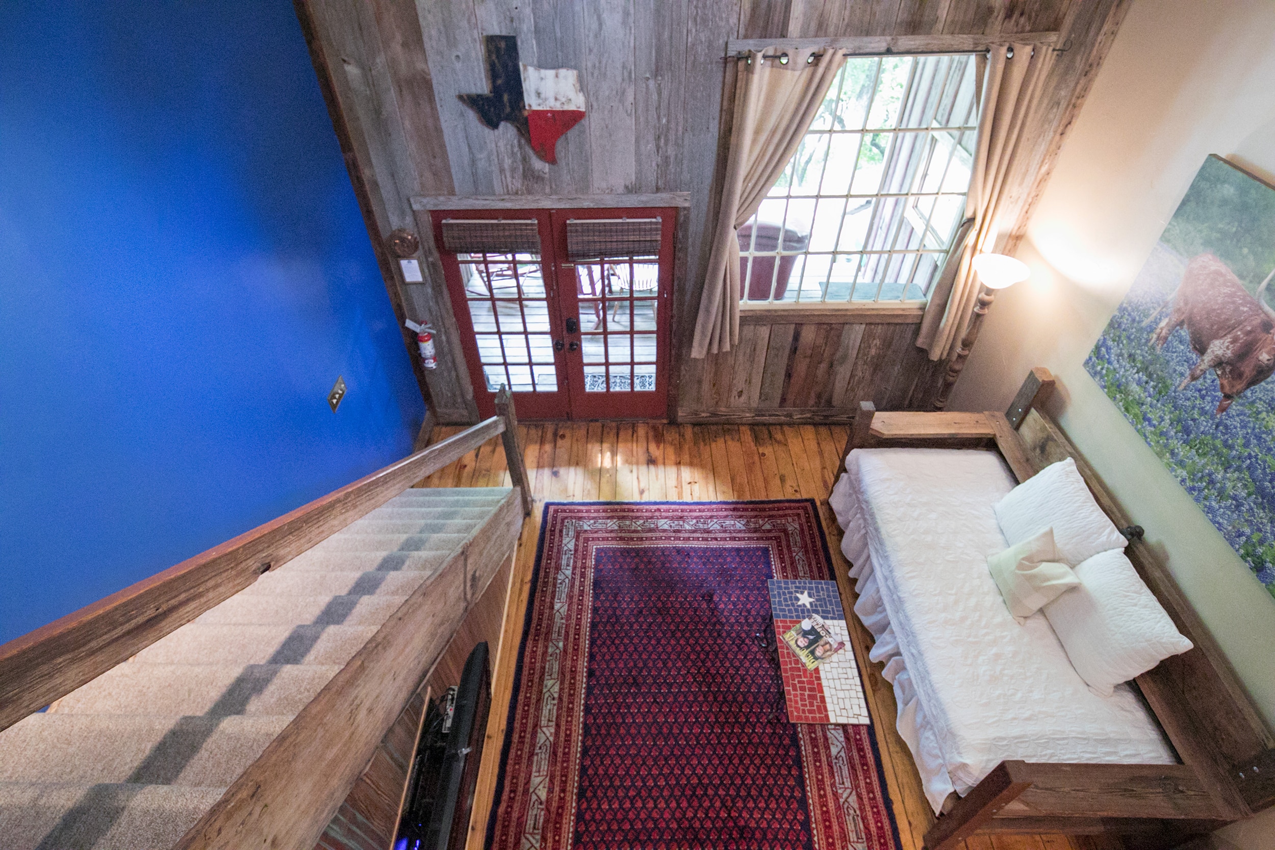 One of our two larger river view rooms, the Bluebonnet Lodge is perfect for families or a friends getaway weekend. Enjoy the relaxing view of the Guadalupe River on the front porch with rocking chairs. The main sitting area has a daybed with trundle, mini refrigerator, cable tv, microwave and a 4 cup coffee maker with a 1/4 bag of coffee. The bedroom has a queen size bed and the open upstairs loft has a full size bed. The bathroom features a antique claw foot tub with shower. This room is priced for 4 guests but can accommodate up to 6. There is a $25 charge/each for the fifth and sixth person.