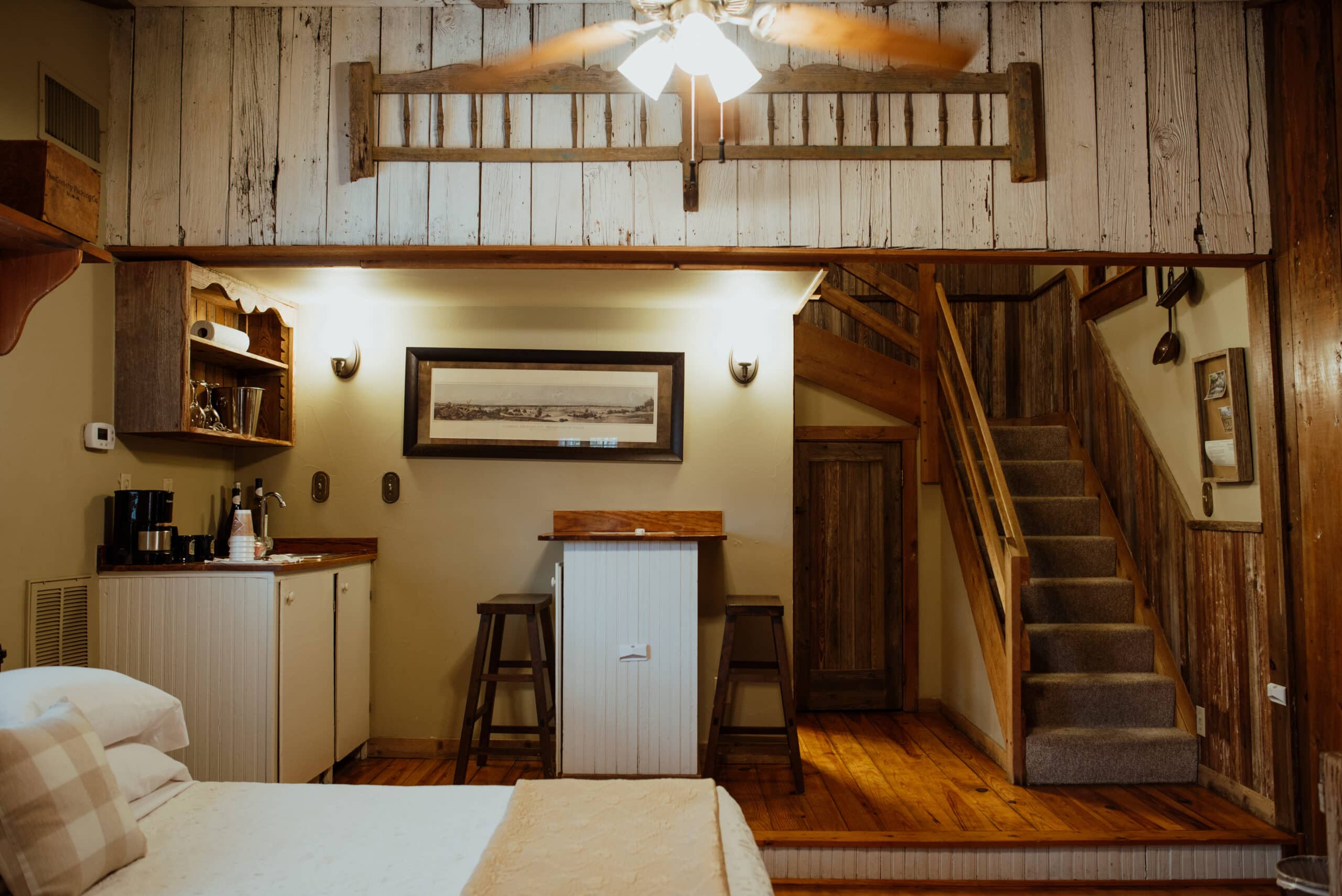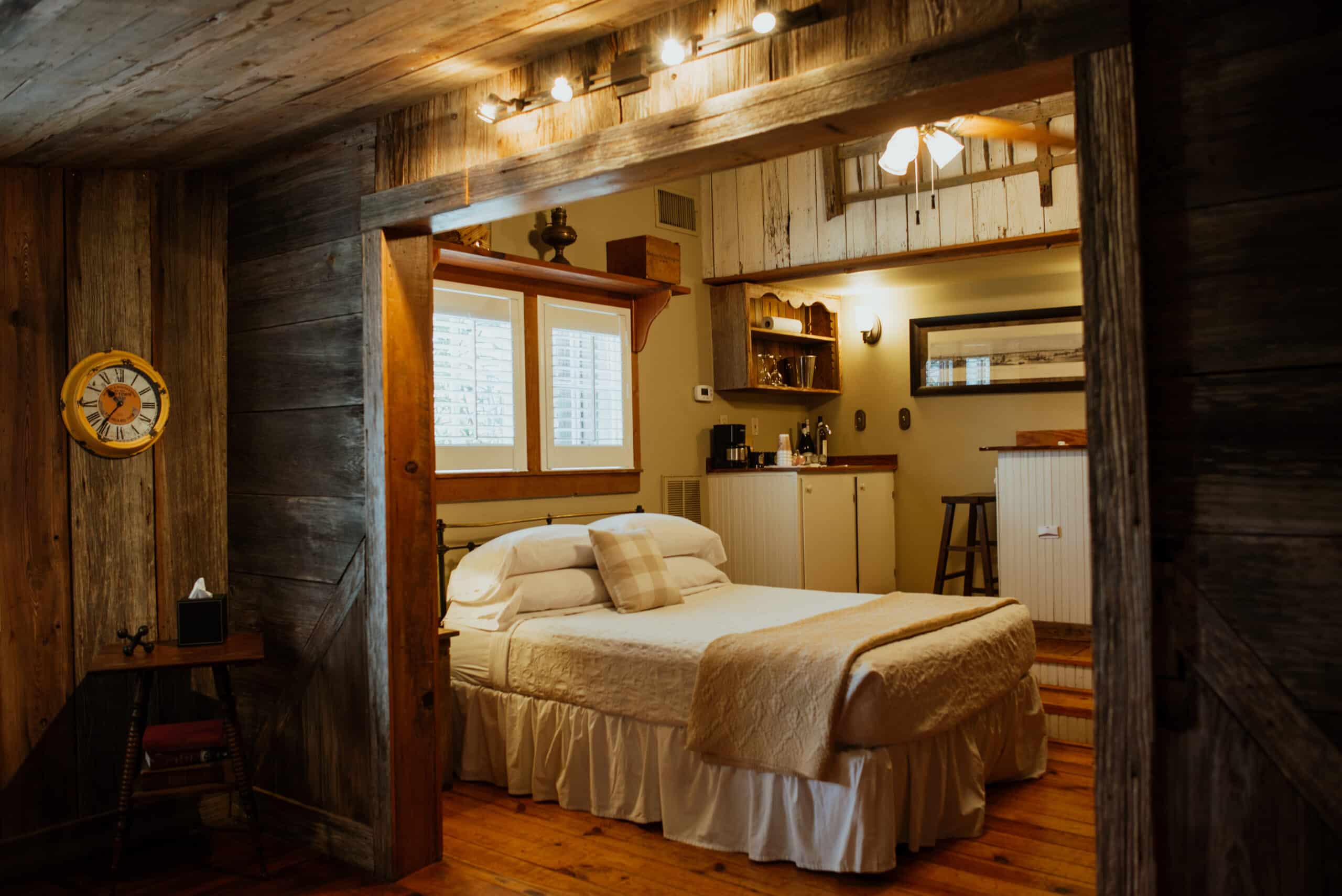 Located in the courtyard, the Corn Crib Cottage is a favorite of families. This cute room has a front sitting room, the main room has a king size bed, cable tv, mini refrigerator, microwave and a 4 cup coffee maker with 1/4 bag of coffee. The bathroom features an antique claw foot tub with shower. The upstairs attic style loft has a full size bed. This room is price for 2 guests but can accommodate up to 4. There is a $25 charge/each for the third and fourth person.