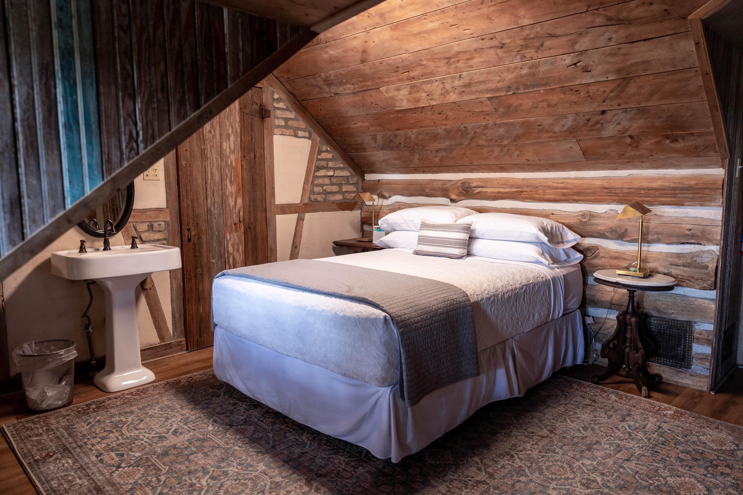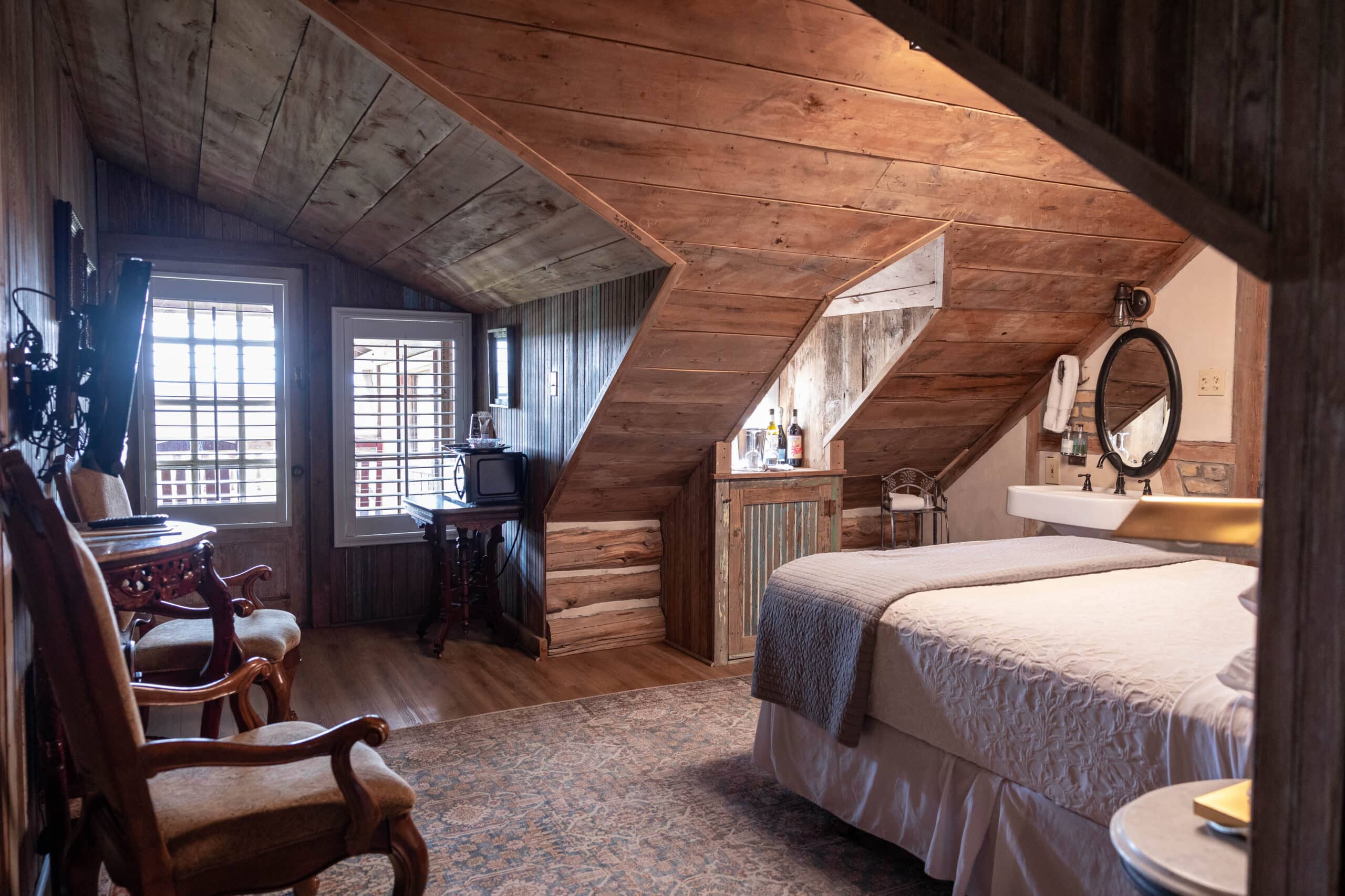 Country Penthaus #14 is a attic style room with a sloped ceiling. This quaint room creates wonderful architectural lines that emphasize the balcony porch and create a cozy spot for the queen size bed. The room features a mini refregerator, cable tv, 4 cup coffee maker with a 1/4 bag of coffee, and bathroom with spacious standing shower. This cozy room offers the best tree top view on the property. PLEASE NOTE: this room may pose a challenge for taller guests.
