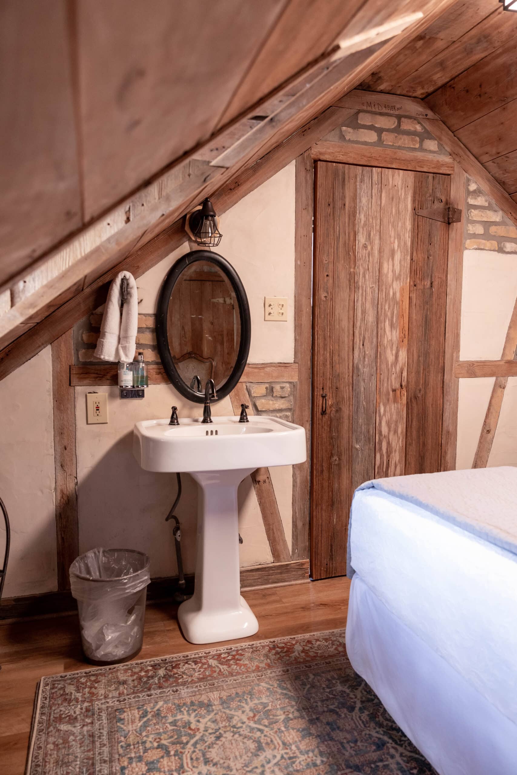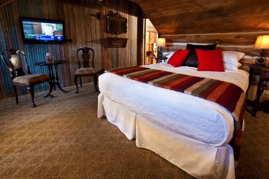 Country Penthaus #15 is a attic style room with a sloped ceiling. This quaint room creates wonderful architectural lines that emphasize the balcony porch and create a cozy spot for the queen size bed. The room features a mini refregerator, cable tv, 4 cup coffee maker with a 1/4 bag of coffee and bathroom with spacious standing shower. This cozy room offers the best tree top view on the property. PLEASE NOTE: this room may pose a challenge for taller guests.