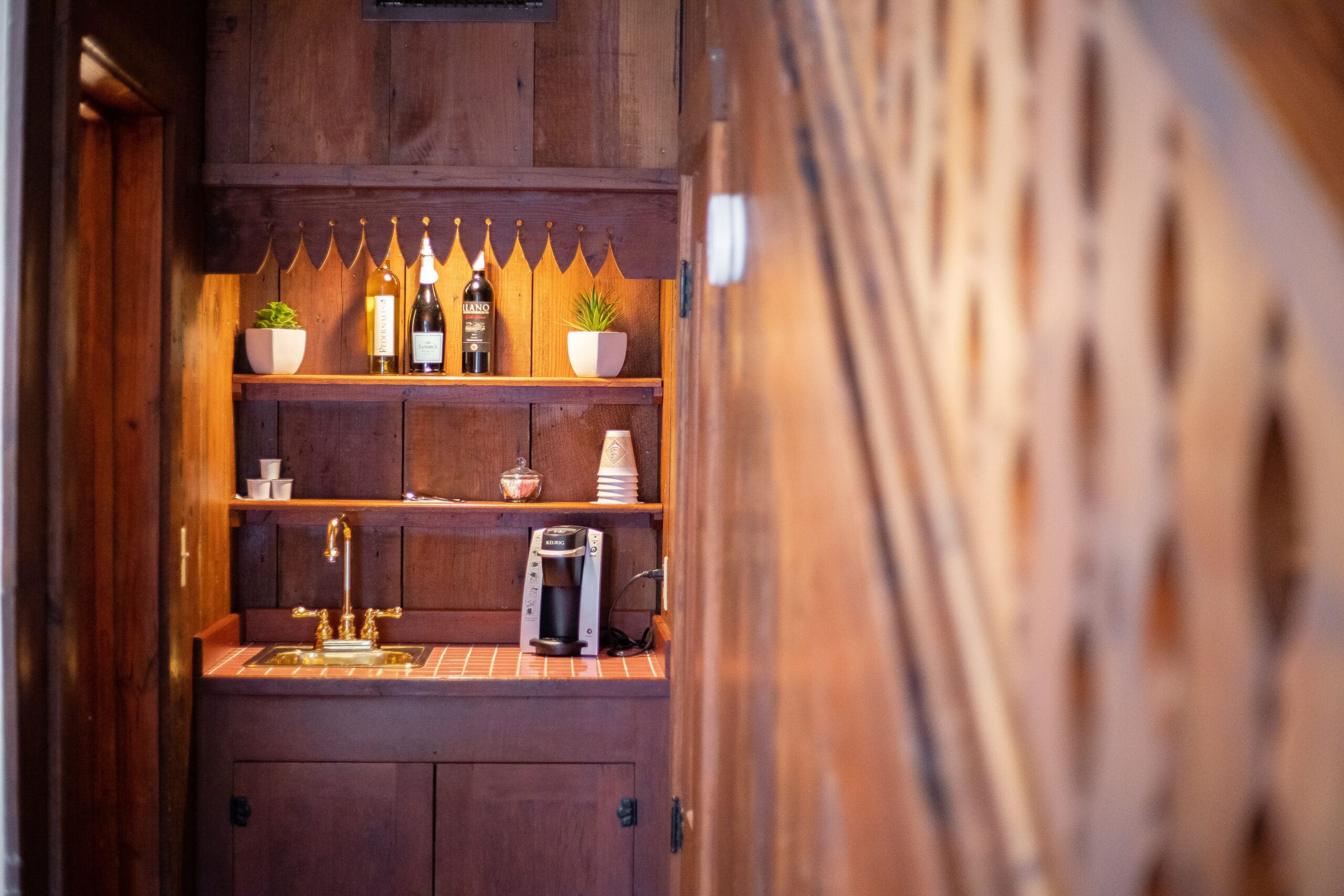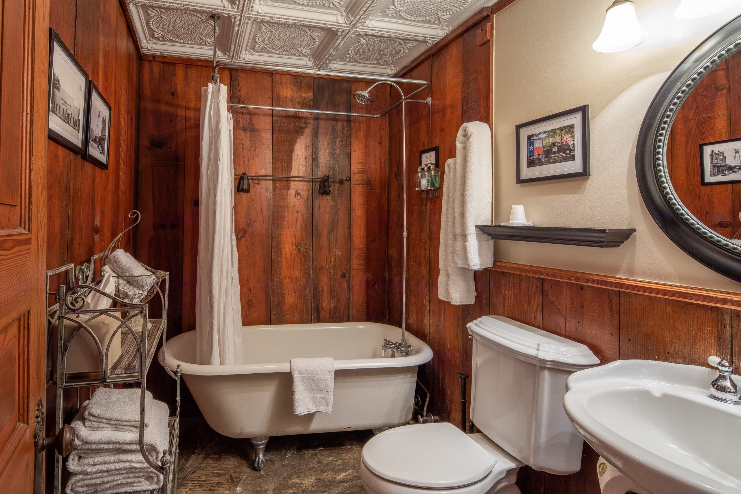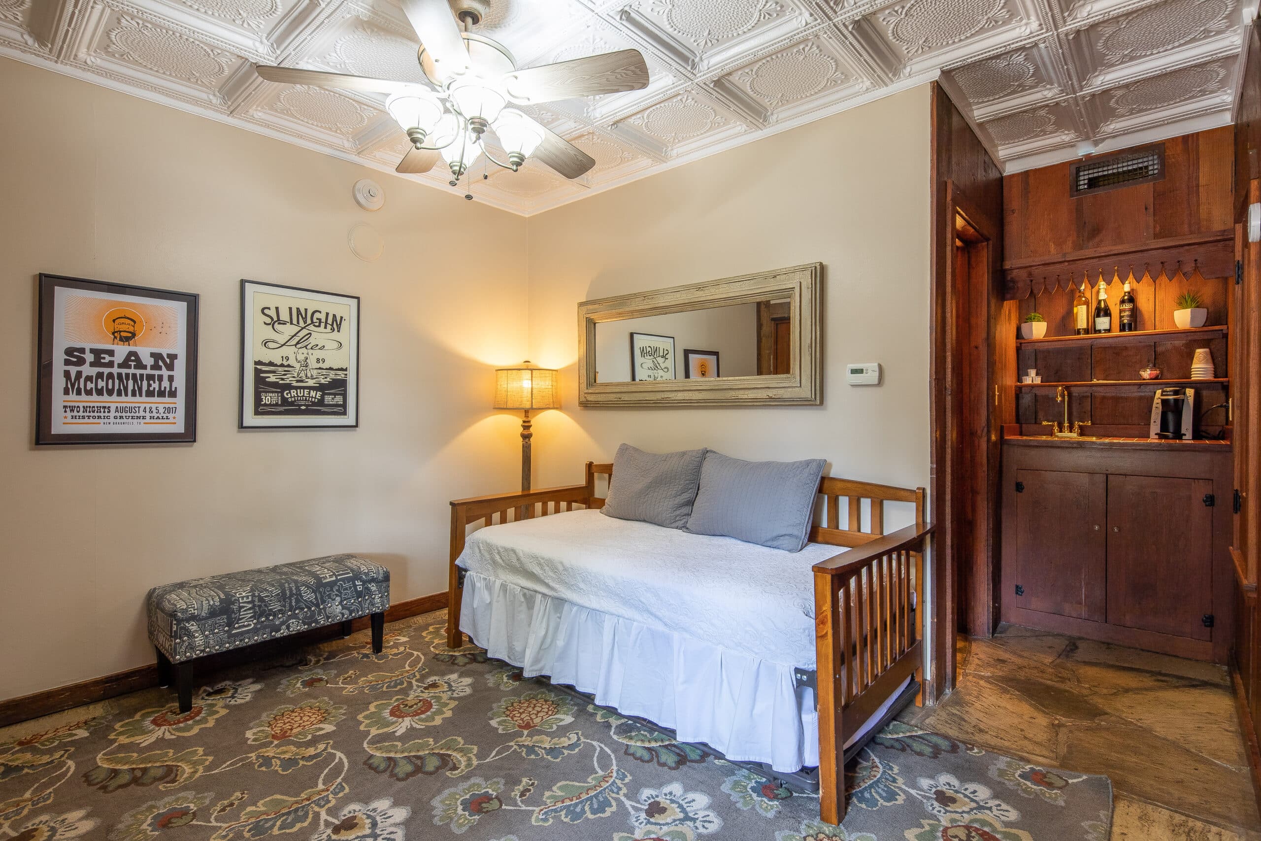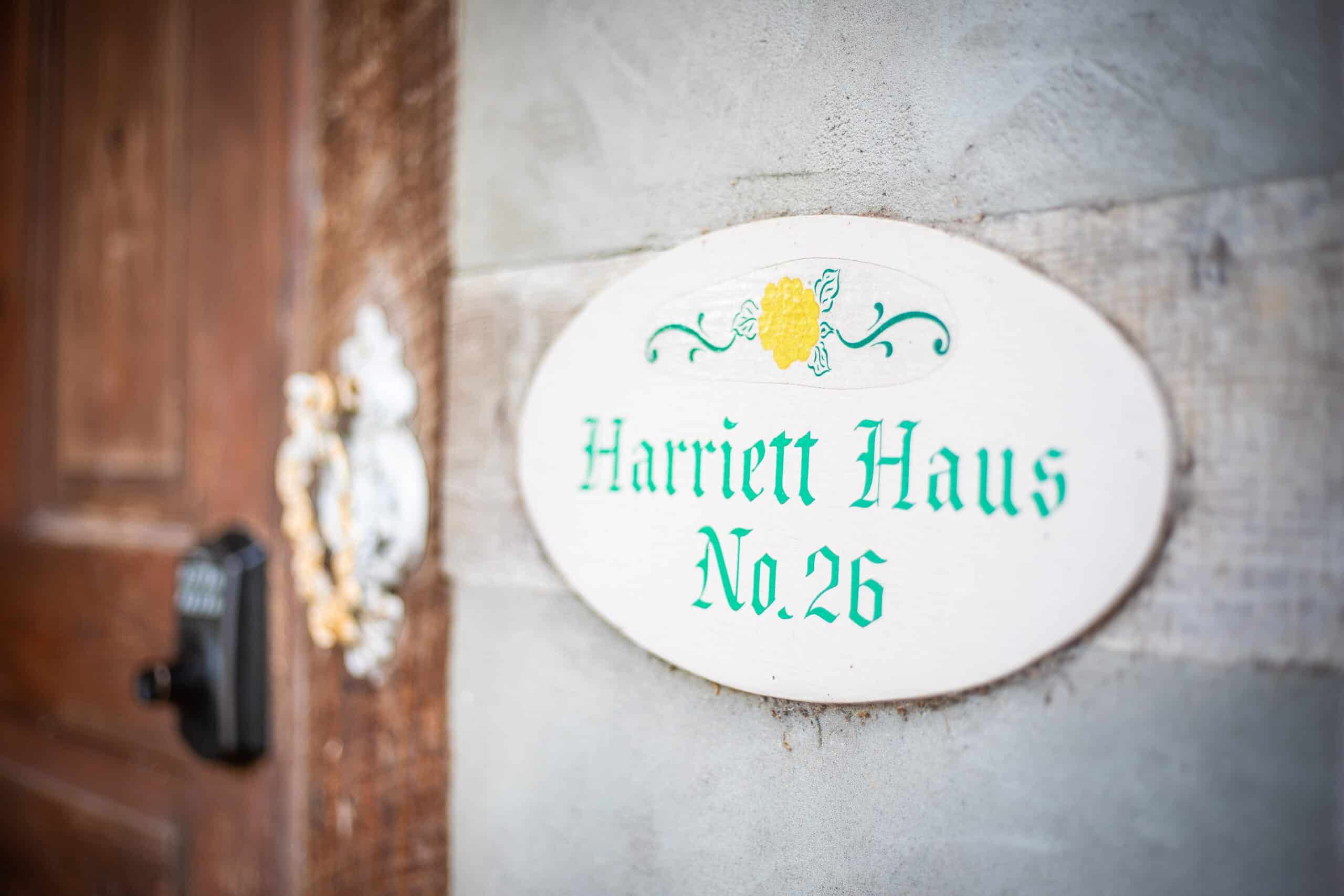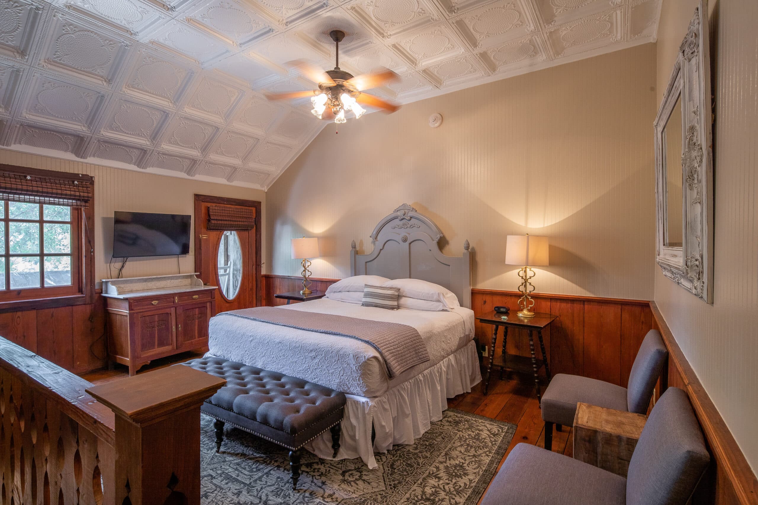 Harriet Haus #26 is located in the courtyard and is a two story room. The main floor has a daybed with trundle, cable tv, mini refrigerator, a 4 cup coffee maker with 1/4 bag of coffee and bathroom with antique claw foot tub with shower. The second floor features the bedroom with king size bed and balcony that overlooks our gorgeous arbor area. This room is priced for 2 guests but can accommodate up to 4. There is a $25 charge/each for the third and fourth person.