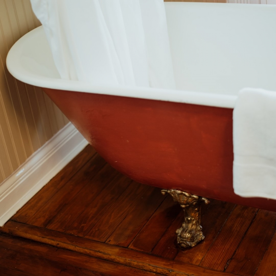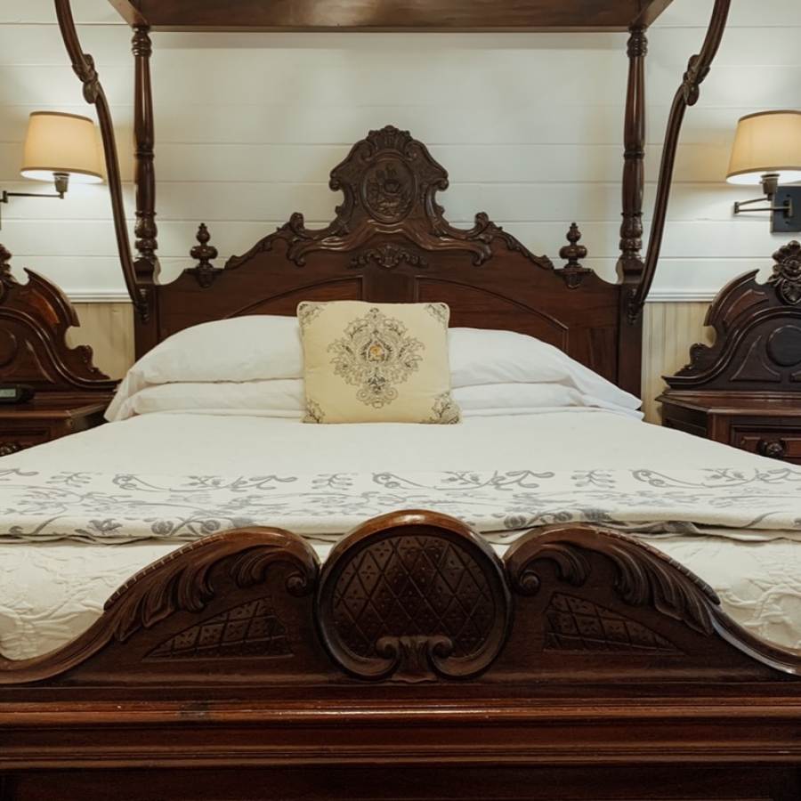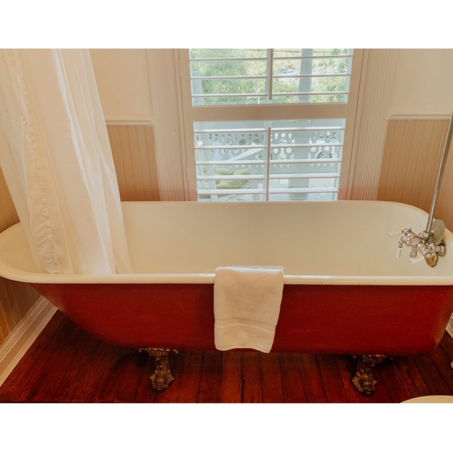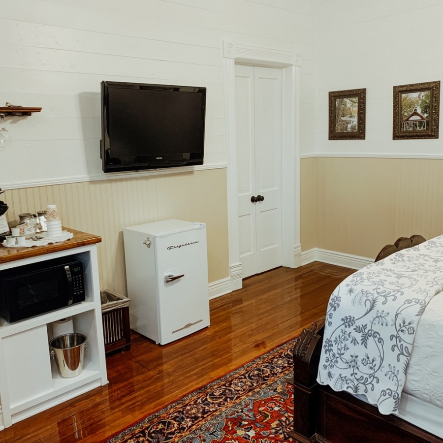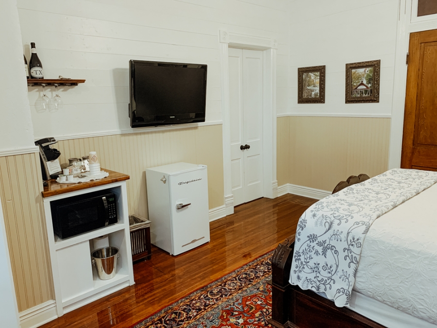 The Master Bedroom has a fantastic mahogany half-canopied bed. The tall ceilings and bay window overlooking Gruene Hall’s biergarden make this a special room. The wrap around balcony is a great spot to enjoy the sights and sounds of Gruene. Please be aware that while we strive to provide a relaxing atmosphere for our guests, you may hear music floating over from the world famous Gruene Hall. This room features a mini refrigerator, microwave, cable tv, a 4 cup coffee maker with 1/4 bag of coffee. There is also a spacious bathroom with antique claw foot tub and shower. The room is on the second level of the Mansion, so we request that it be occupied by adults only.