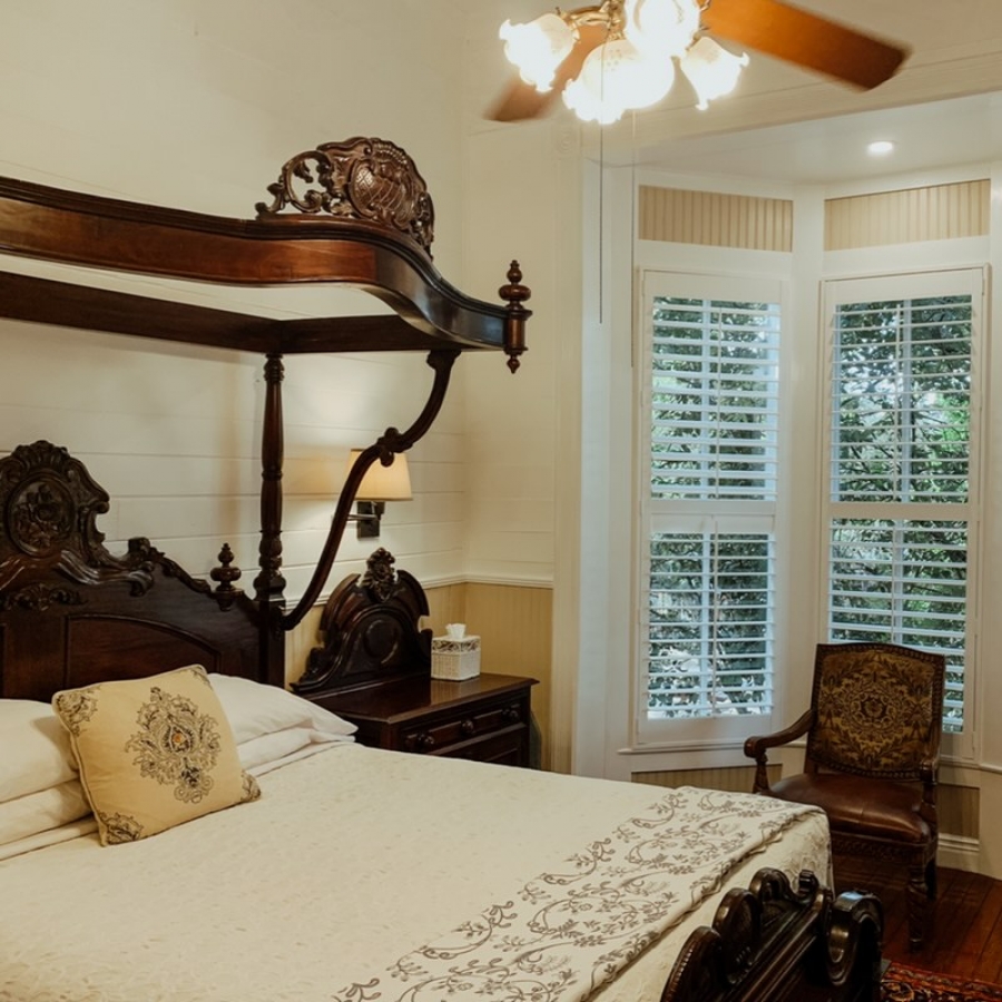 Elegant room with a mahogany half-canopied bed, bay-window views of Gruene Hall’s biergarten, a wraparound balcony, and a spacious claw-foot bath.