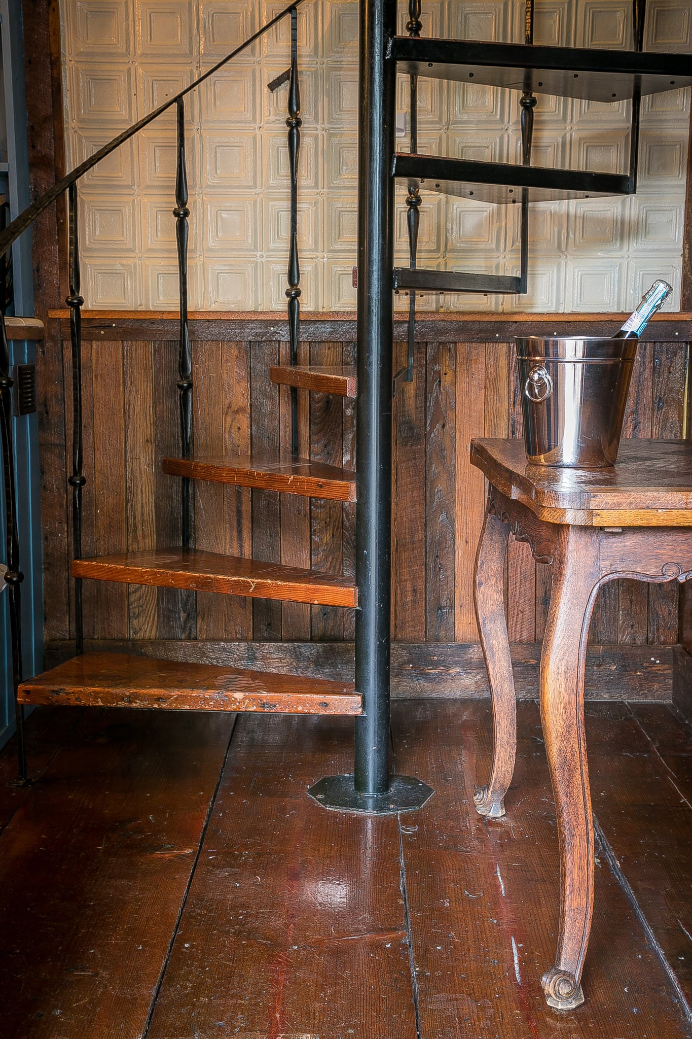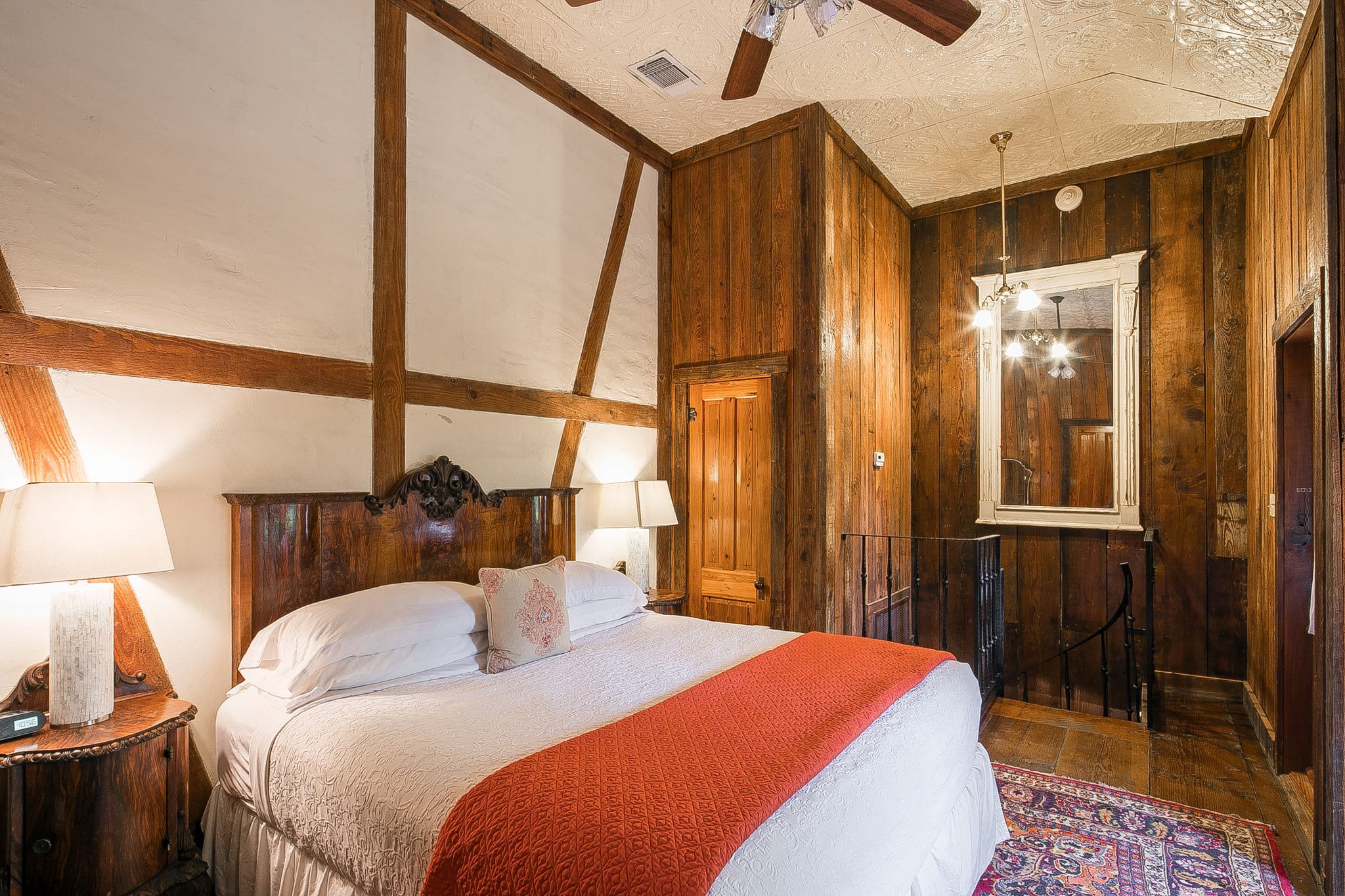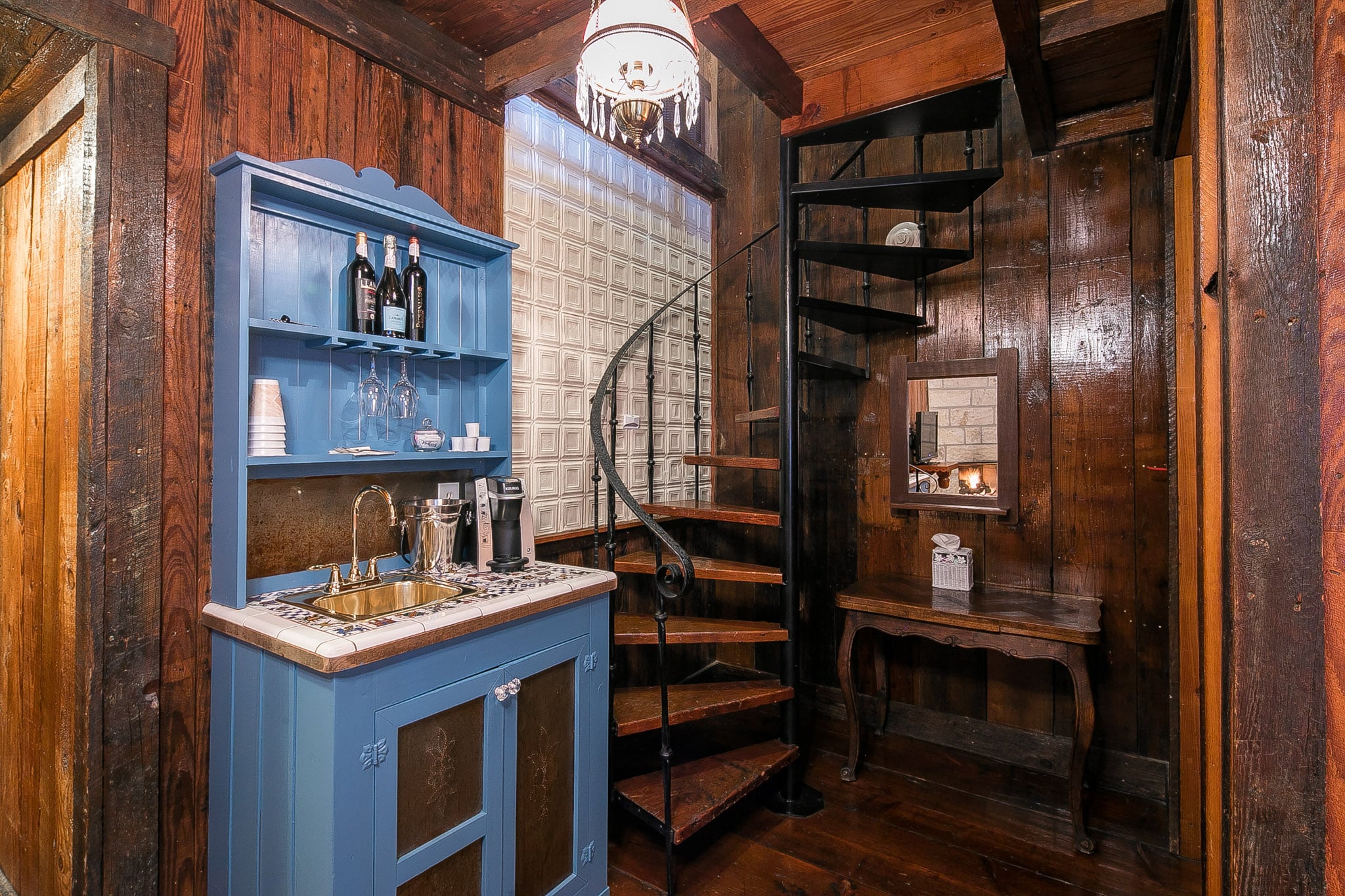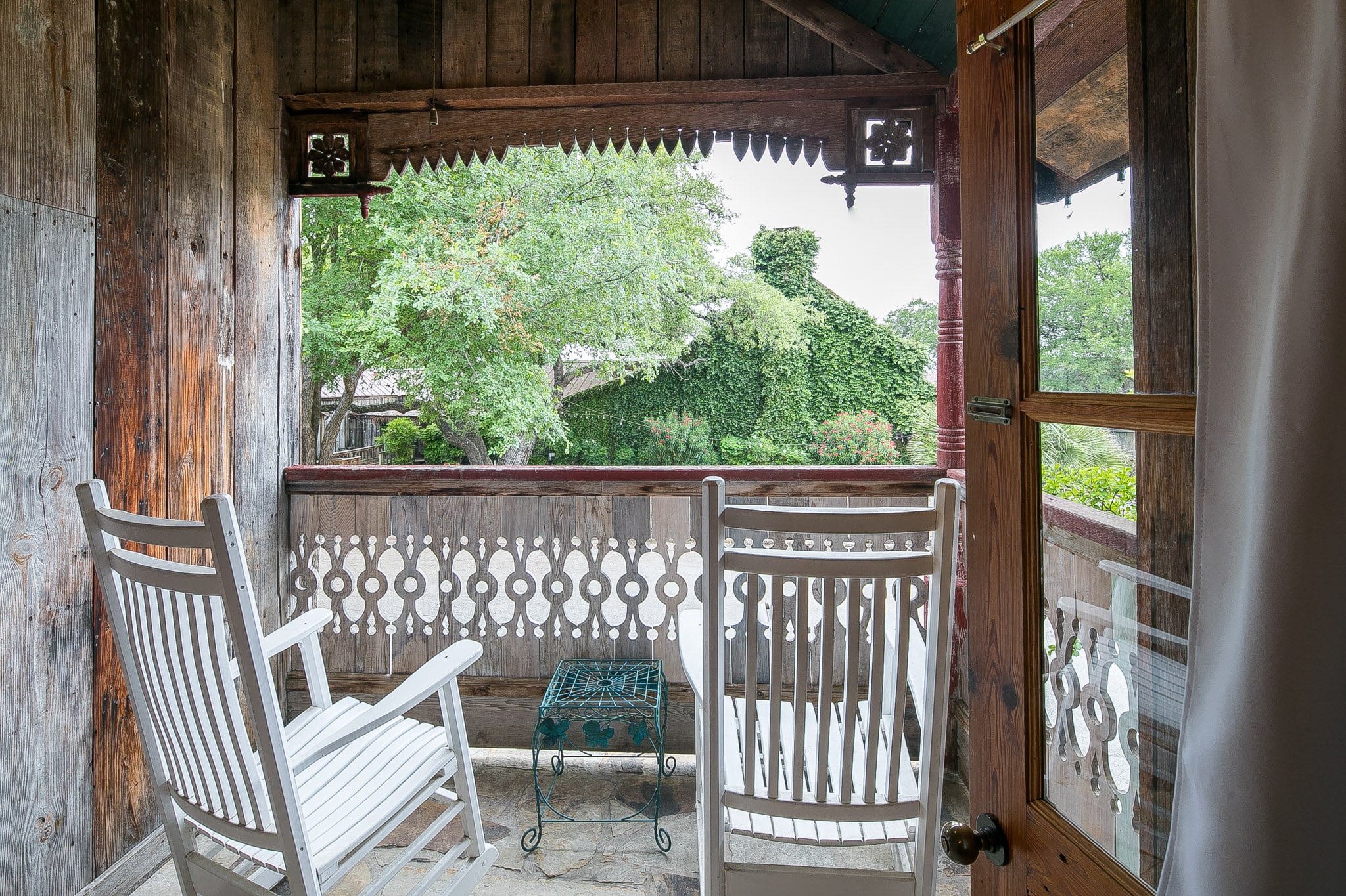 Courtyard two-story with a fireplace, king bedroom via spiral staircase, claw-foot tub, and a balcony for enjoying Gruene’s music.