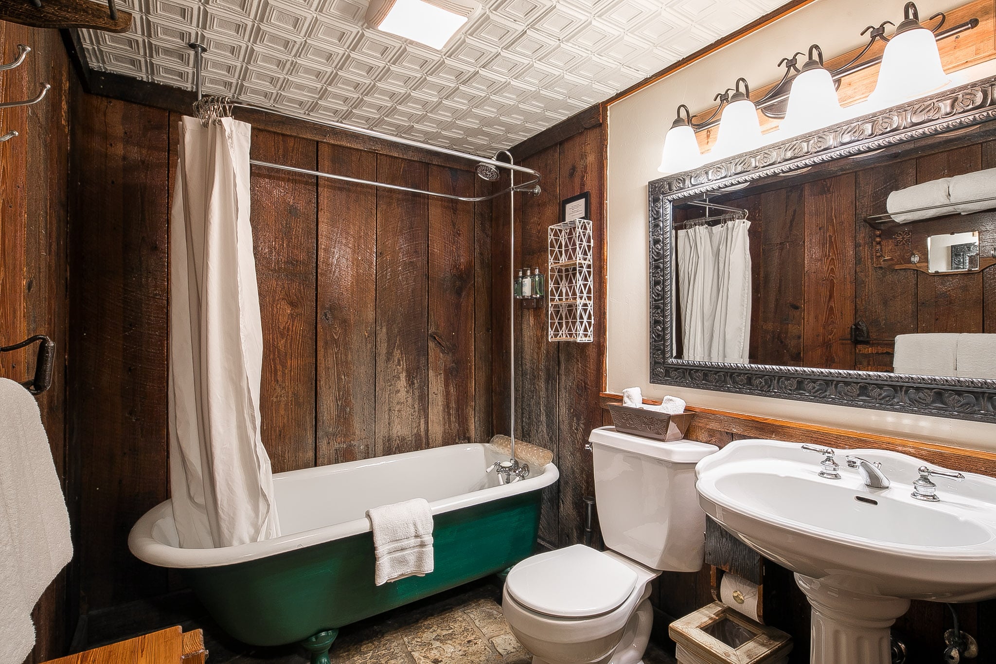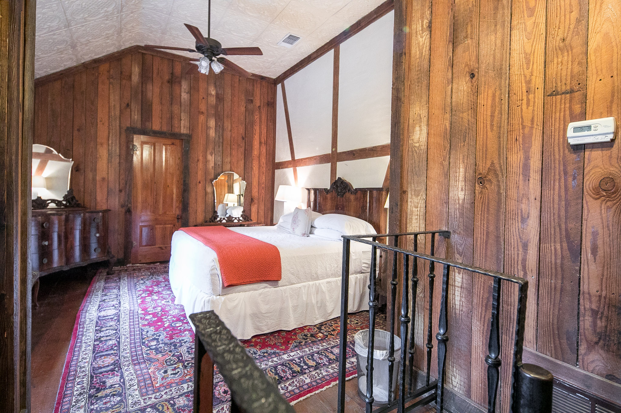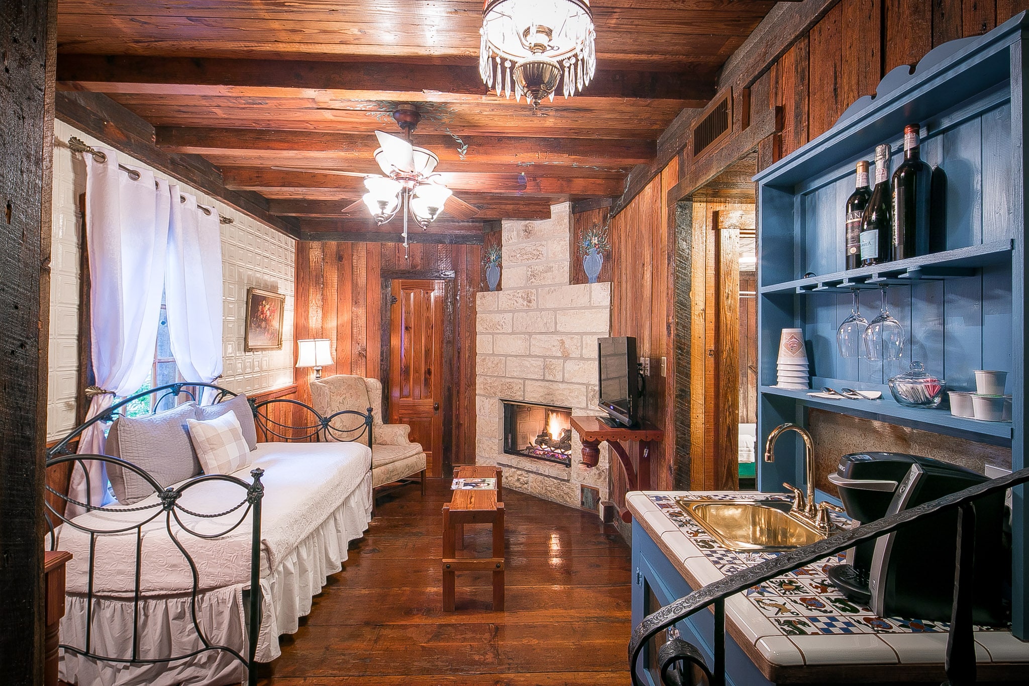 Located in the courtyard, Sunday Haus #18 is a lovely two story room. As you enter you will find a daybed with trundle, gas fireplace (seasonal), and bathroom with antique claw foot tub with shower. The room also features cable tv, mini refrigerator, microwave and 4 cup coffee maker with a 1/4 bag of coffee. Up the iron spiral staircase you will find the bedroom with king size bed. The bedroom also features a balcony where you can enjoy the music and sounds of Gruene. This room is priced for 2 guests but can accommodate up to 4. There is a $25 charge/each for the third and fourth person.