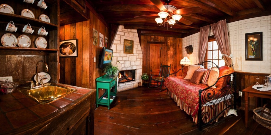 Located in the courtyard, Sunday Haus #22 is a lovely two story room. As you enter you will find a daybed with trundle, gas fireplace (seasonal), and bathroom with antique claw foot tub with shower. The room also features cable tv, mini refrigerator and a 4 cup coffee maker with 1/4 bag of coffee. Up the iron spiral staircase you will find the bedroom with king size bed. The bedroom also features a balcony where you can enjoy the music and sounds of Gruene. This room is priced for 2 guests but can accommodate up to 4. There is a $25 charge/each for the third and fourth person.