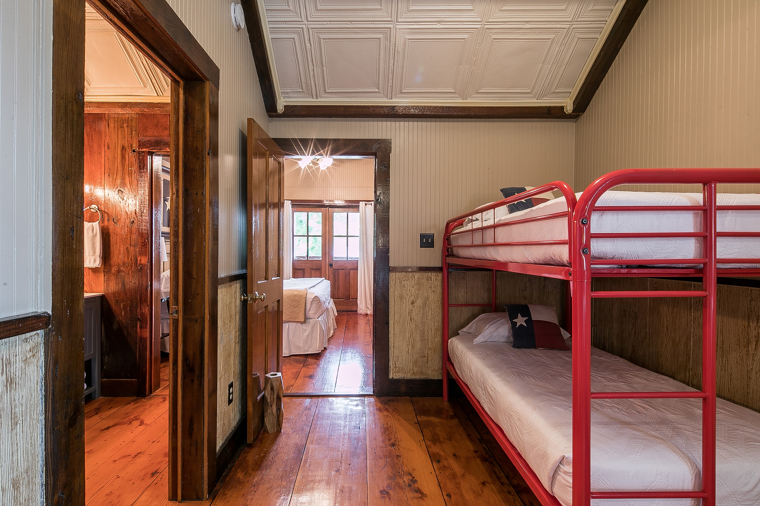 Explore our newest offering, the Texas Suite, located in our lovely courtyard. This delightful upstairs room features a king-size bed in the bedroom, a queen-size Murphy bed, and a bunk bed in the living area, all fitted with flat-screen TVs. The suite also boasts a bathroom with a classic clawfoot tub and a double vanity. Guests will appreciate additional amenities, including a mini fridge, sink, microwave, and a 4-cup coffee maker complete with a quarter bag of coffee.
